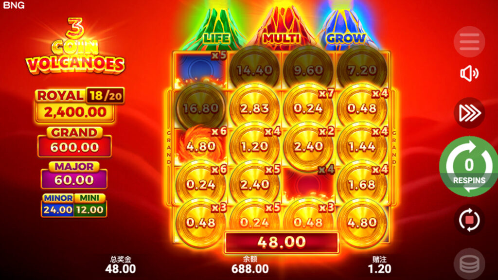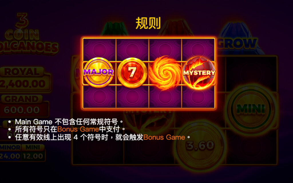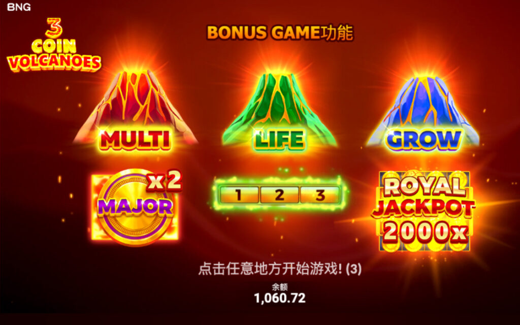 當任意有效線上出現 4 個相同符號 時,即可觸發紅利遊戲,進入三輪重轉 Bonus Game。在紅利期間,MULTI、GROW、LIFE 三大火山功能將隨機啟動,透過倍數強化、盤面擴展與重轉延命機制,持續累積 COIN 獎金並推進 JACKPOT 進度。免費重轉次數可無上限延長,每當盤面再次收集 3 個以上 Bonus 符號,即可額外獲得 +1 次重轉,讓紅利節奏不斷延燒;其中 MULTI 火山更會隨機加入 ×2~×10 倍 倍數,疊加場上所有符號金額,最終結算時具備直衝 ×2,000 倍 JACKPOT 的高爆發潛力。