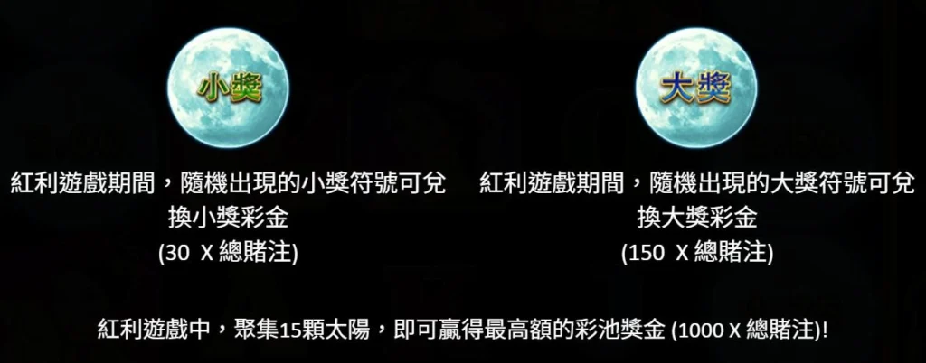 紅利期間,每顆太陽符號都可能隨機顯示獎金倍率,包括 小獎 ×30 倍、大獎 ×150 倍,甚至直衝 終極 Jackpot ×1,000 倍。只要在紅利回合中 集滿 15 顆太陽符號,即可提前鎖定並直接贏得最高 ×1,000 倍投注額 的終極彩池大獎,爆擊感十足,獎金結算方式說明紅利遊戲結束後,畫面上所有太陽符號所顯示的獎金倍率將 一次性加總結算並發放,不存在逐顆兌換的風險,爆擊感十足。