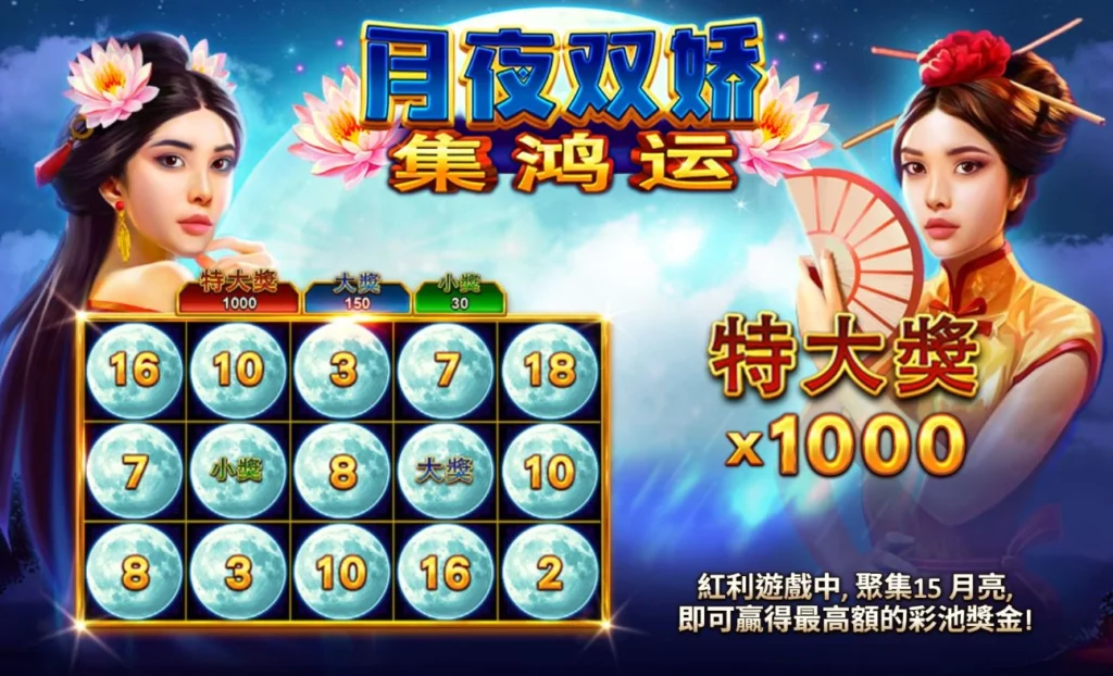 在RK娛樂城,若你正在尋找一款視覺質感高、紅利節奏快、又具備 Jackpot 爆發力的老虎機,那麼由 BNG電子 打造的《月夜雙嬌-集鴻運》絕對值得優先體驗。本作以東方古典仕女與中秋賞月文化為靈感,結合 5 軸 25 線固定賠付 與 Hold & Win 太陽紅利機制,不僅畫面賞心悅目,更具備最高 ×1,000 倍投注額 的終極彩池獎勵,是一款兼顧美感與爆擊潛力的高人氣紅利型老虎機。