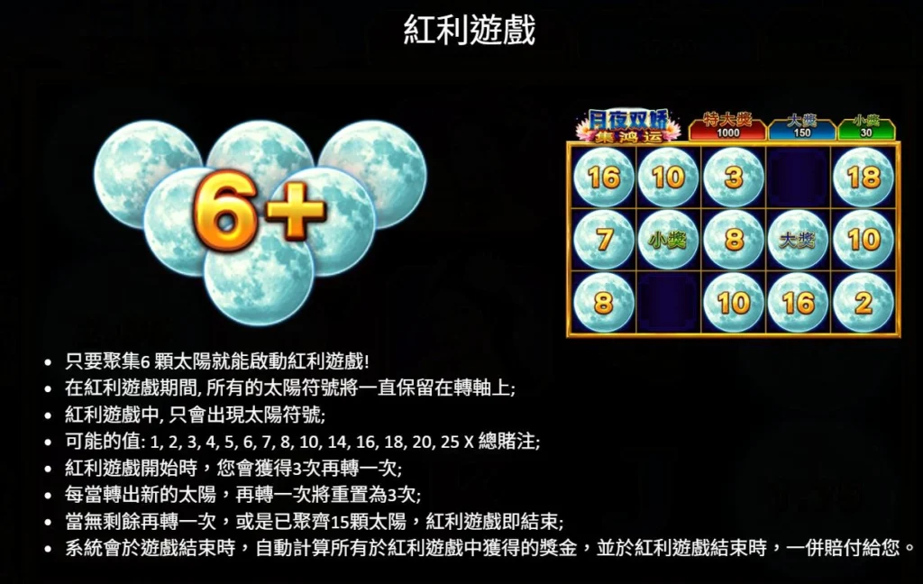 當轉盤上出現 6 顆以上「太陽」符號,即可立即觸發 Hold & Win 太陽紅利回合。進入紅利模式後,所有太陽符號將全面鎖定,並提供 3 次重轉機會;每當新增 1 顆太陽,重轉次數即重置為 3 次,讓紅利回合有機會不斷延續。若連續轉動未再出現新太陽且次數歸零,紅利回合即告結束。